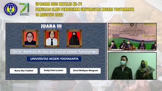 A new era of education is characterized by peeragogy and cybergogy because the COVID-19 impact presents a challenge for teachers to continue innovating and creating effective learning. The difficulty of direct face-to-face and physical contact in learning is a serious challenge because the attention, concentration, and practice of students are difficult to monitor. One such challenge occurred in religious learning activities: reading and memorizing the Al-Qur'an for deaf children. The limitation of accommodative resources for reading and memorizing the Al-Qur’an is what inspired a team of PLB students to create innovative learning media. The team led by Dewi Meiliyan Ningrum, with team members Nunu Nurfadilah and Vially Putri Lestari, created an application of Al-Quran Signs (QIRAT) that can be used by children with hearing impairment. The excellent thing about this application is that it is created with sign movement accompanied by interpreting for lip shape pronunciation, the videos tutorial, and the validation of user movements as evaluations. The menu contained in the application consists of a list of the surah, a list of the movements of Arabic letters, and the validation of user movements. In the validation of this movement, children with hearing impairment record movements on a smartphone screen, and then the application will scan to determine movement accuracy. Surely the application's development will make it easier for children with hearing impairment to read and memorize the Al-Qur’an on their own, especially during online learning. The team is guided by Rendy Roos Handoyo, M. Pd. who successfully won third place at the National Scientific Writing Competition on the Anniversary of the Faculty of Education 71st. The product that was developed is currently in the prototype stage and will continue to be validated until it could be disseminated. the team is motivated to continue to develop products that can be useful for children with hearing impairment. Support was also given by the judges when the team was presenting, they were expecting the product will be continued to propagate so that it made it easier for the learning to read and memorize the Al-Qur’an for children with hearing impairment.